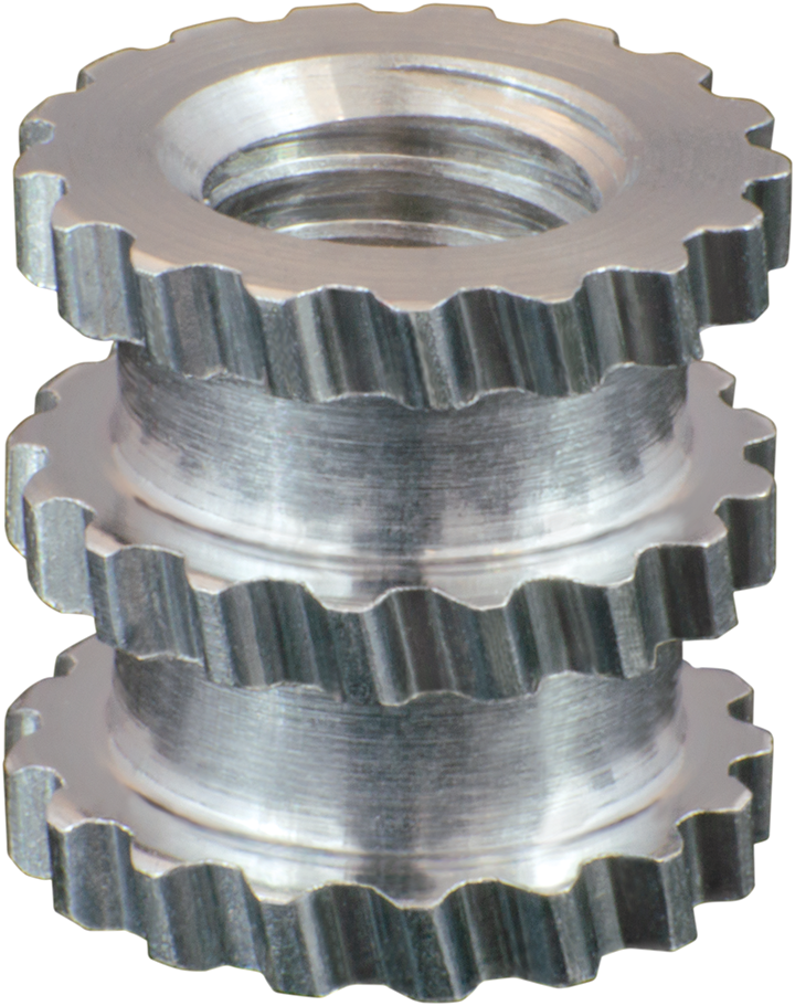 Molded-In Inserts are designed for maximum pull-out and torque performance, and are often the Insert of choice for thermosets and engineered plastics with a high percentage of filler. The Series 63 Through-Hole Insert is symmetrical which eliminates having to orient the Insert when placing it onto the core pin in the mold. The minor thread diameter tolerance is controlled to ensure positive positioning and perpendicularity of the Insert on the core pin during the molding process. Series 63 Inserts are made from lightweight, lead-free 2024 aluminum, and are available in inch threads ranging from 8-32 to 5/16-18.