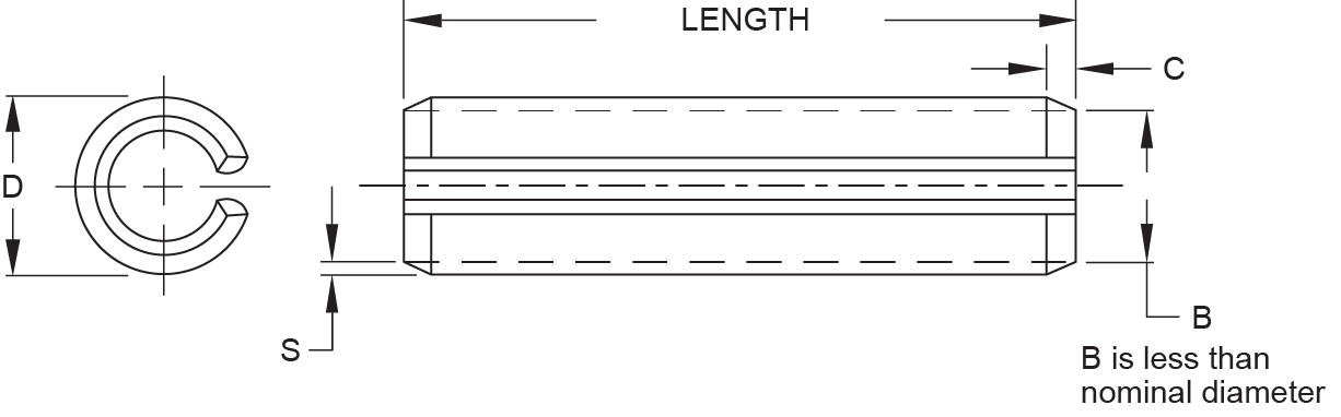In addition to SPIROL’s Standard Metric Slotted Pins, SPIROL offers a standard line of ISO 8752 Slotted Spring Pins to meet the market demand for these pins. SPIROL offers Slotted Spring Pins manufactured to the ISO 8752 specification in diameters ranging from 2mm to 12mm in both high carbon steel and nickel (austenitic) stainless steel in plain finish. SPIROL does not offer ISO 8752 pins with zinc plating due to the propensity for ISO 8752 pins to interlock during the plating process.